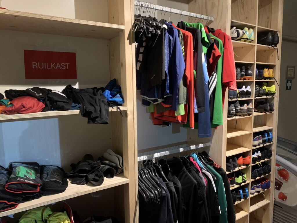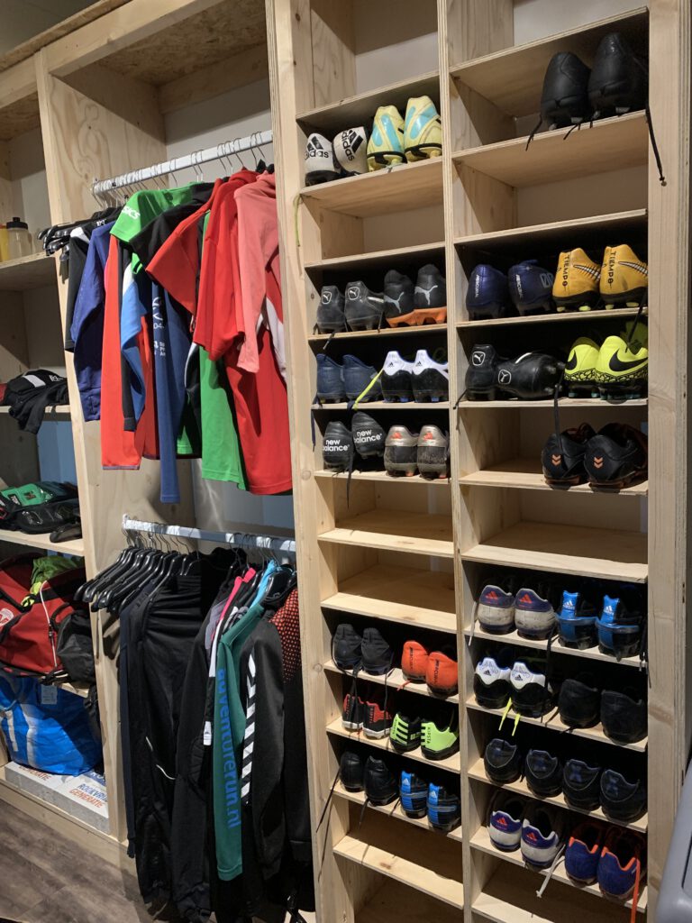 In de kast liggen en hangen volop sportspullen: voetbalschoenen in allerlei maten, sportkleding en zelfs mooie voetbalshirts van grote clubs. Alles is vrij te gebruiken.